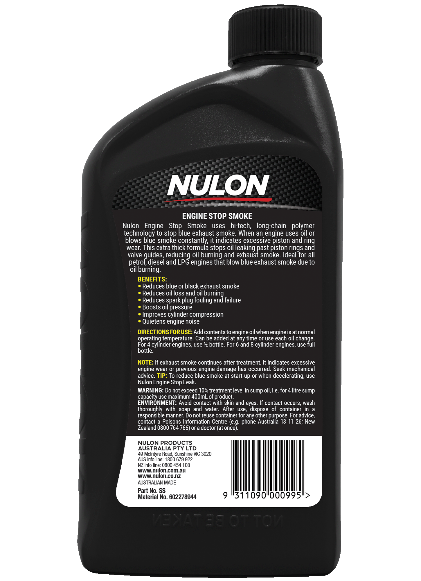 Nulon Engine Stop Smoke uses hi-tech, long-chain polymer technology to stop blue exhaust smoke. When an engine uses oil or blows blue smoke constantly, it indicates excessive piston and ring wear. This extra thick formula stops oil leaking past piston rings and valve guides, reducing oil burning and exhaust smoke. Ideal for all petrol, diesel and LPG engines that blow blue exhaust smoke due to oil burning.